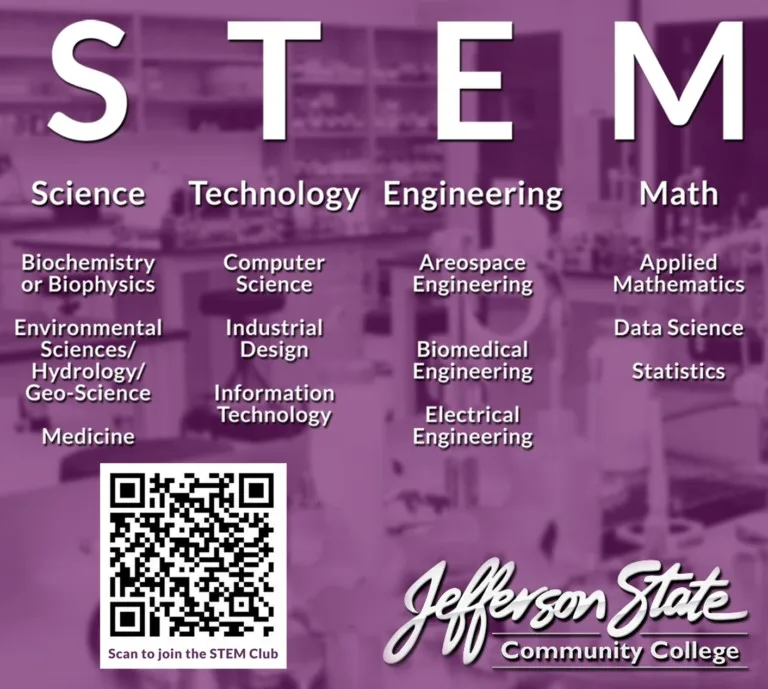 The STEM club welcomes all JSCC students interested in science, technology, engineering, and math, regardless of whether they are pursuing a STEM degree or not. The goal is to increase the number of students majoring in STEM programs at JSCC by educating students on career and educational opportunities within STEM fields. The STEM club will provide opportunities to connect with like-minded students, meet professionals in various STEM fields including experts from UAB and local biotechnology companies, participate in various on and off-campus activities, and potentially participate in a paid summer undergraduate research experience.